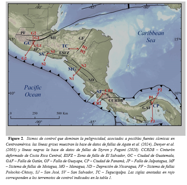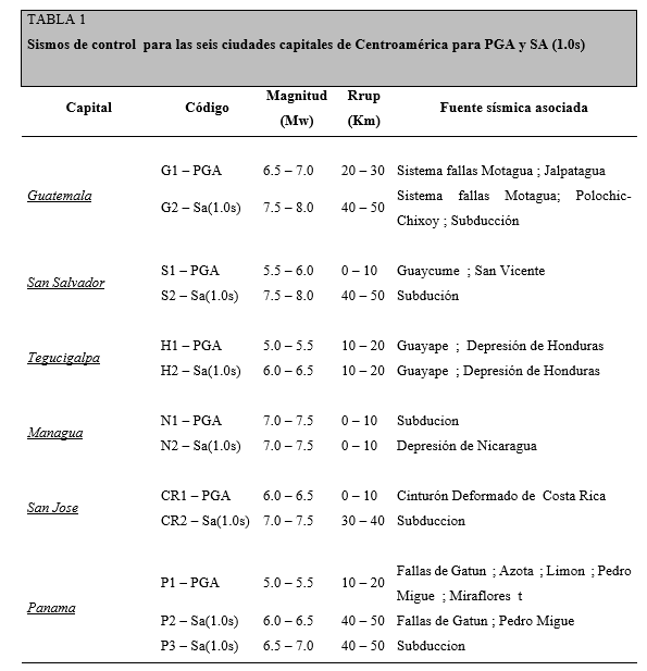 El mapa de peligrosidad regional actualizado KUKAHPAN-25 muestra valores de PGA mayores en relación con modelos anteriores como Benito et al (2012), en consonancia con la tendencia general al alza observada en estudios de peligrosidad nacionales durante la última década. Los valores máximos de PGA alcanzan hasta 0.8g, 1.0g y 1.2g para períodos de retorno de 475, 975 y 2475 años, respectivamente, ubicándose los valores más altos en las penínsulas de Costa Rica y el sur de Guatemala (Fig. 1). En las capitales, los espectros de peligrosidad uniforme (UHS) más altos se estiman en San Salvador, Managua y San José, Costa Rica, seguidos de Ciudad de Guatemala, Tegucigalpa y Panamá. La identificación de los sismos de control mediante desagregación muestra que tanto las fuentes de subducción como las correspondientes a fallas corticales contribuyen a los niveles de peligro en estas capitales, con la excepción de Tegucigalpa, donde la subducción no es dominante. Los escenarios locales de fallas identificados son: falla Motagua-Polochic Chixoy y Jalpatagua en Guatemala; Guayume y San Vicente en El Salvador; sistema de fallas de Guayape y la depresión de Honduras en Honduras; fallas en la depresión tectónica de Nicaragua; sistema del cinturón deformado central en Costa Rica y las fallas de Gatún, Azota, Limón, Pedro Miguel y Miraflores en Panamá (Fig. 2). La magnitud Mw y las distancias Rrup de los sismos de control para el movimiento de corto y largo período se incluyen en la Tabla 1.