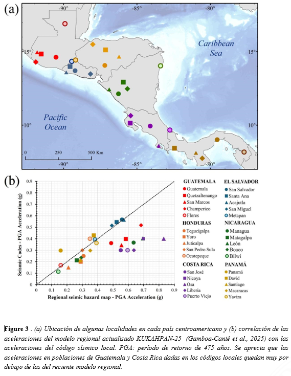 Los valores de PGA del modelo regional KUKAHPAN-25 coinciden con los provistos según códigos en El Salvador, Honduras y Panamá para las ciudades analizadas. En cambio, existen diferencias sustanciales en Guatemala, Costa Rica y Nicaragua, cuyos códigos provén aceleraciones notablemente más bajas. A la luz de los resultados de este estudio estos códigos resultan poco conservadores.